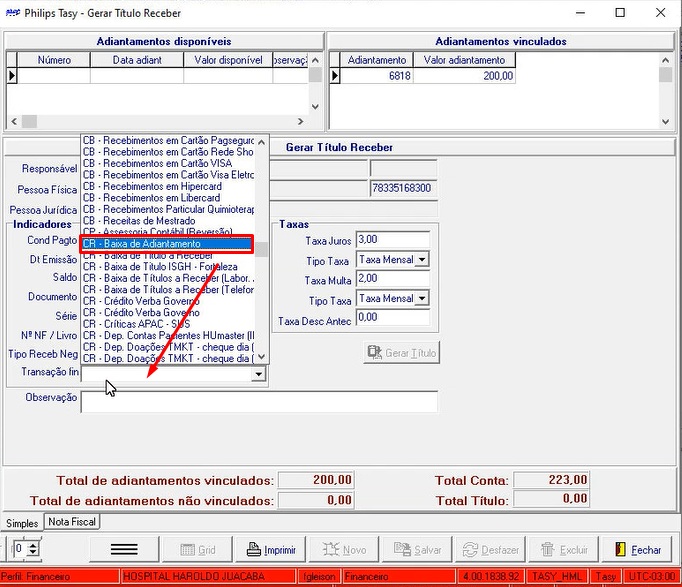 O objetivo desta OS foi tratar o campo Transação Fin., alimentado ao informar um adiantamento em Gerar Título a Receber, porém não exibia a informação alimentada na aba Baixa.