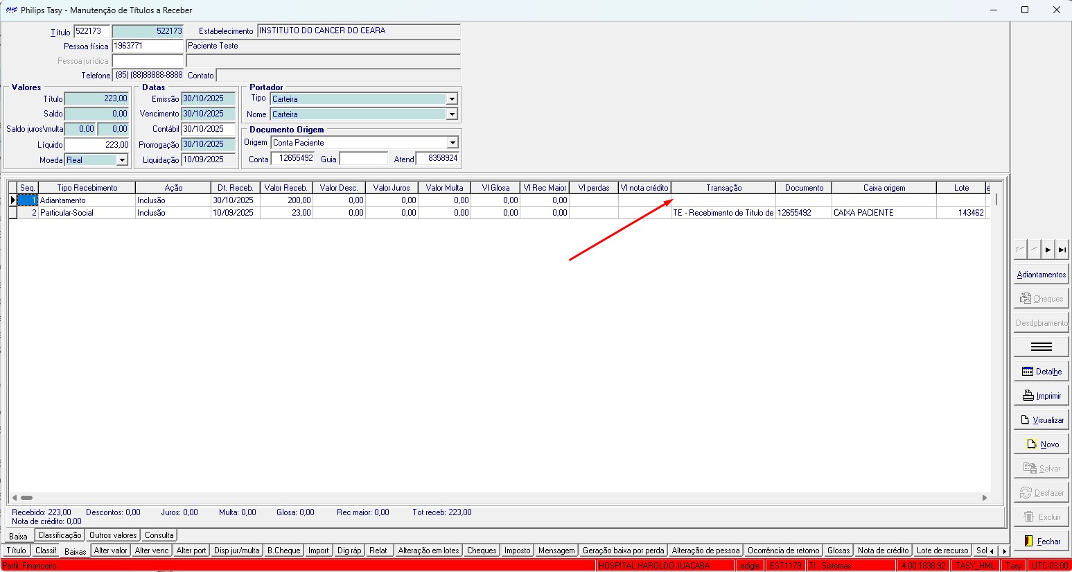 Consultar o título e verificar, na aba Baixa, se a transação cadastrada anteriormente está sendo exibida corretamente.